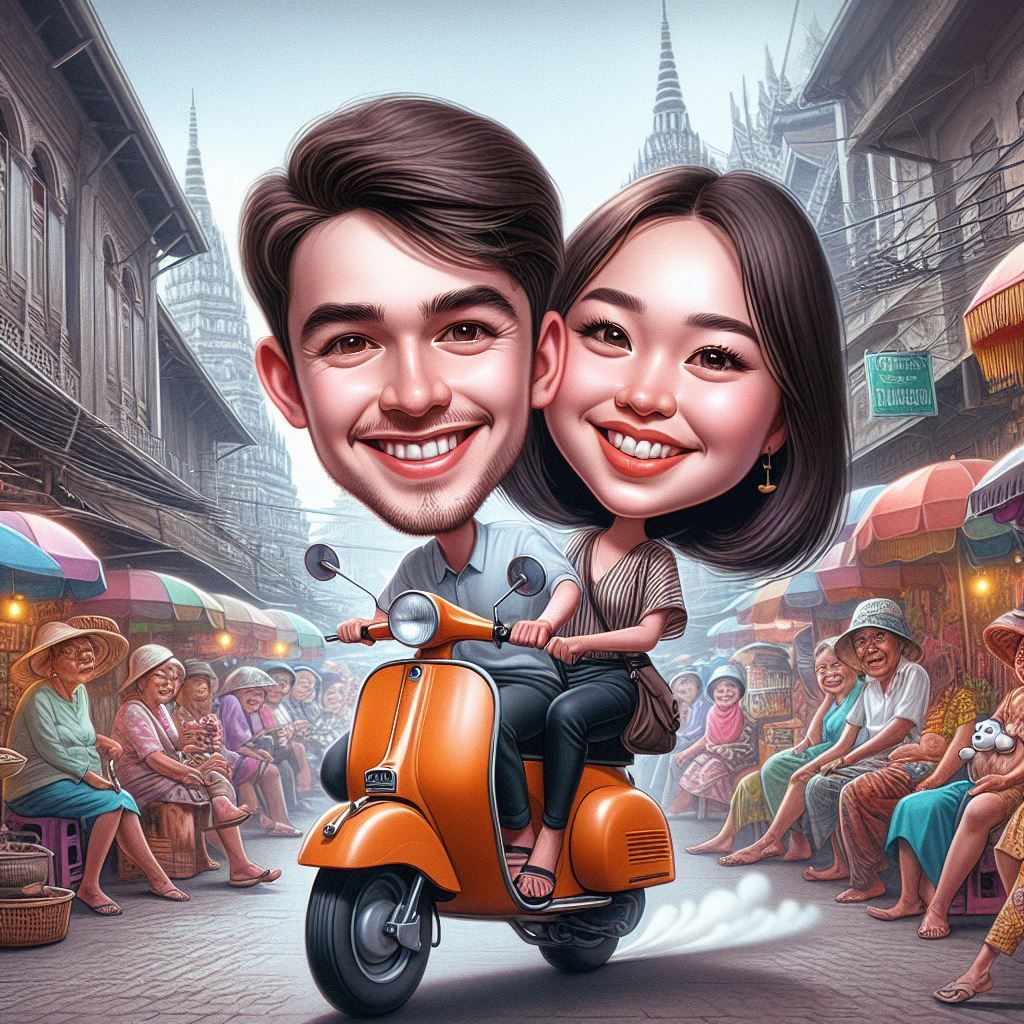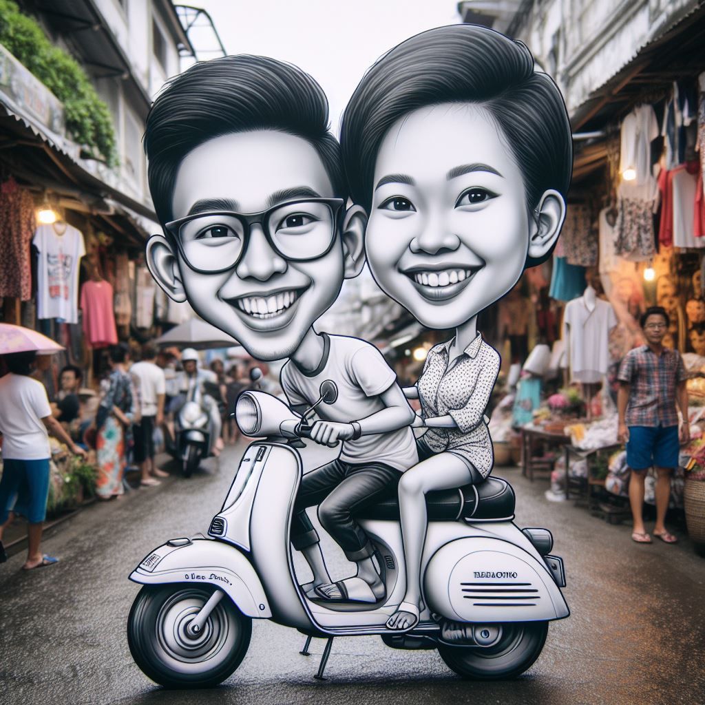 Sebuah foto karikatur seorang pemuda dan wanita berkepala besar yang sedang mengendarai vespa, melewati pasar yang ramai, keduanya tersenyum bahagia, detail rumit.